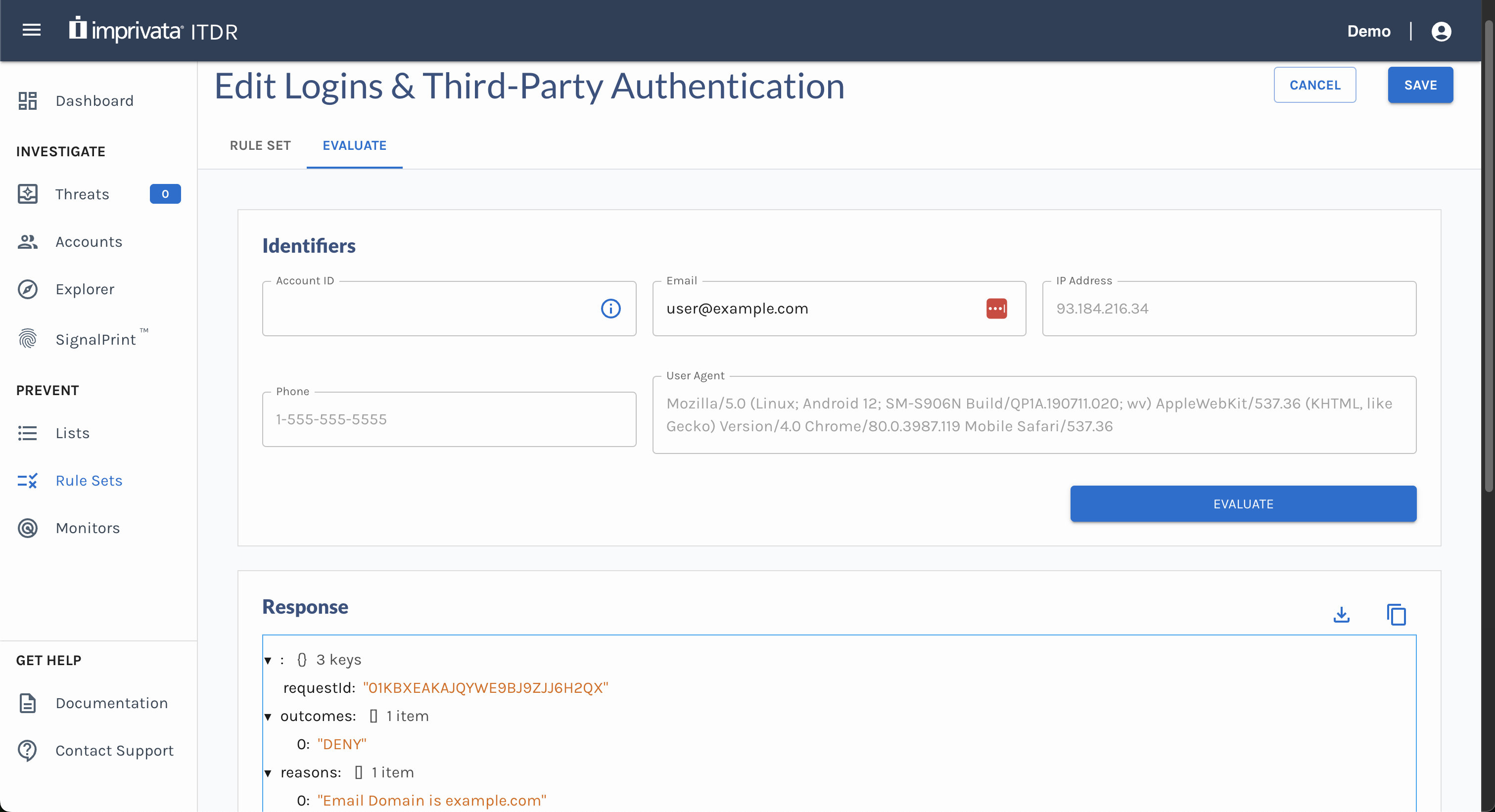 To ensure your rules functioned as intended, use the Evaluate tab to test them. Enter an account ID, email, IP address, phone number, and/or user agent and click Evaluate. Check the response to see whether the rule worked as intended.