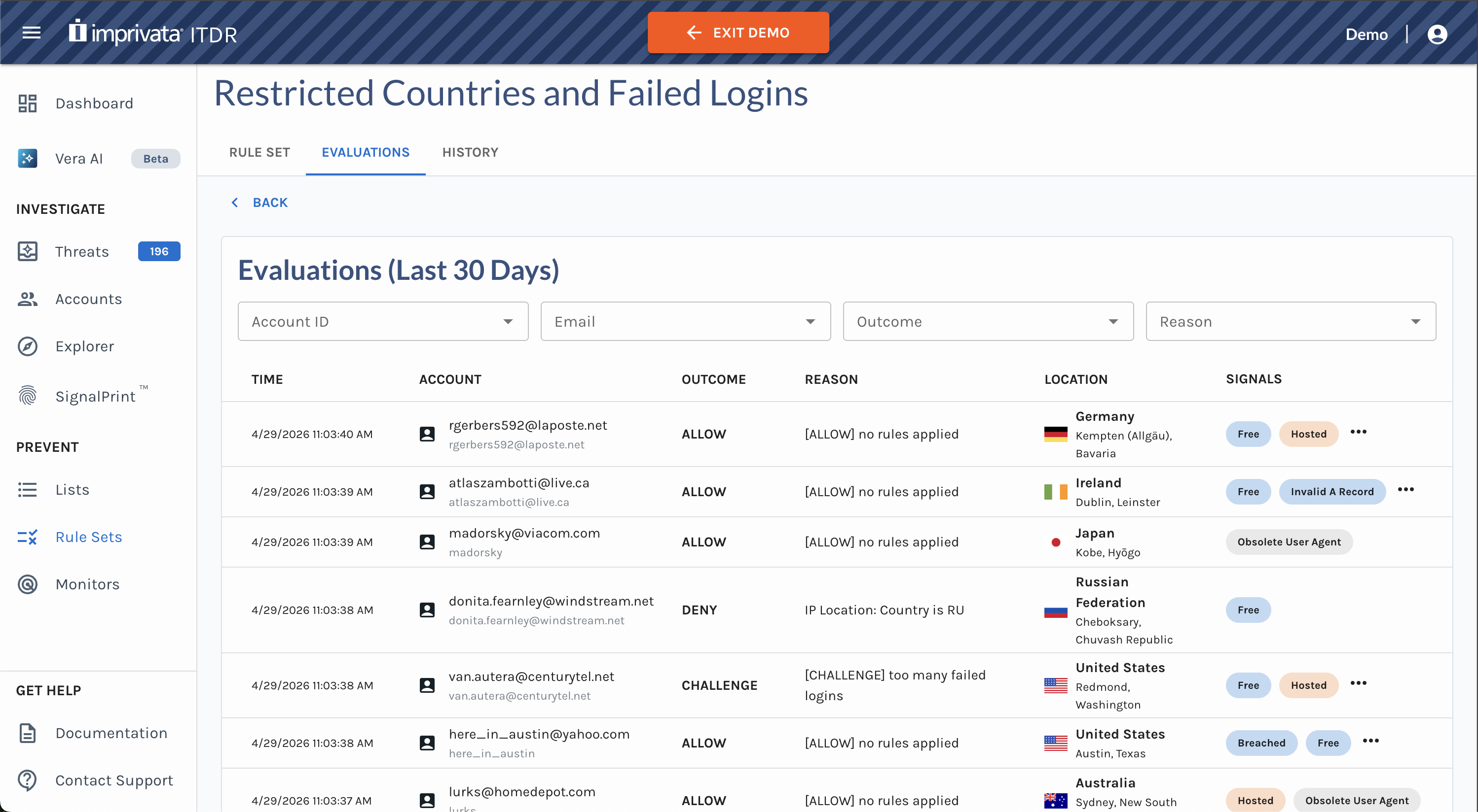 Rule Set Evaluations shows authentication activity evaluated by a specific rule set over the last 30 days. Use this tab to understand what happened during a specific authentication event without leaving the rule set context.