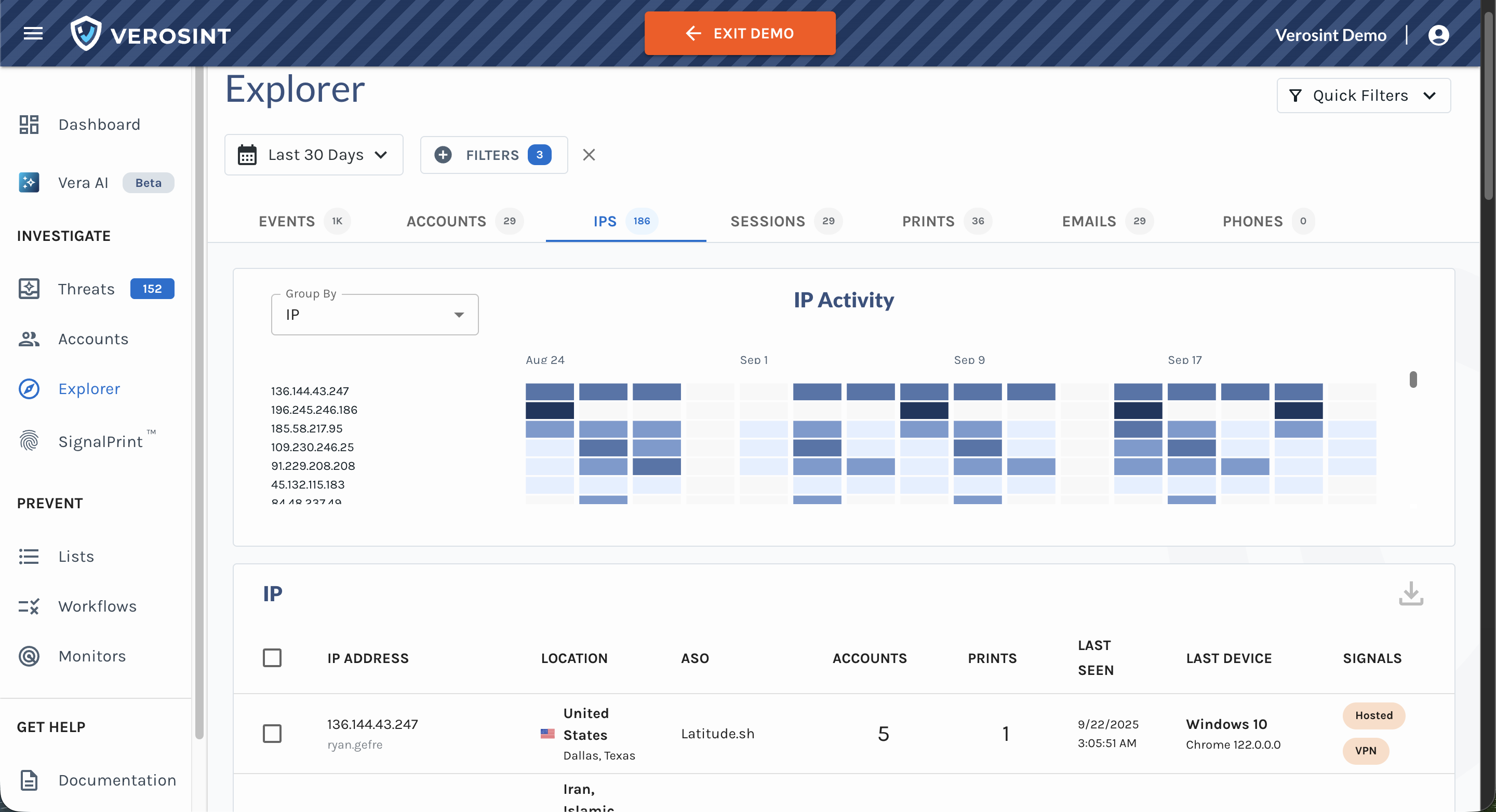 - Toggle between Events, Accounts, IPs, Sessions, Prints, Emails, or Phones tabs to view results from different angles.