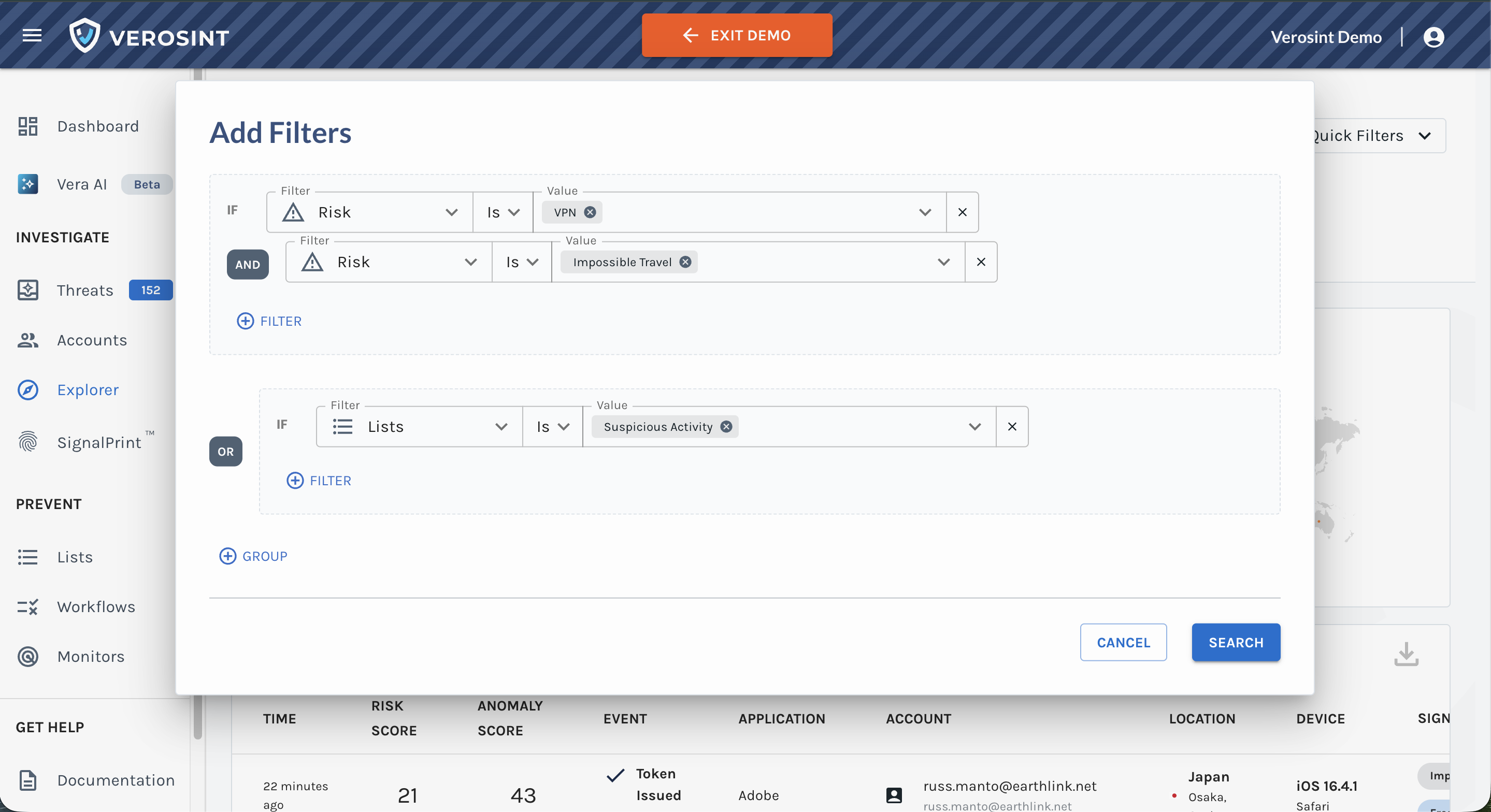 - Easily search across standard filters — Identifiers, Lists, Risks, and Signals — to focus on what matters most. Search for event data within the last 180 days.