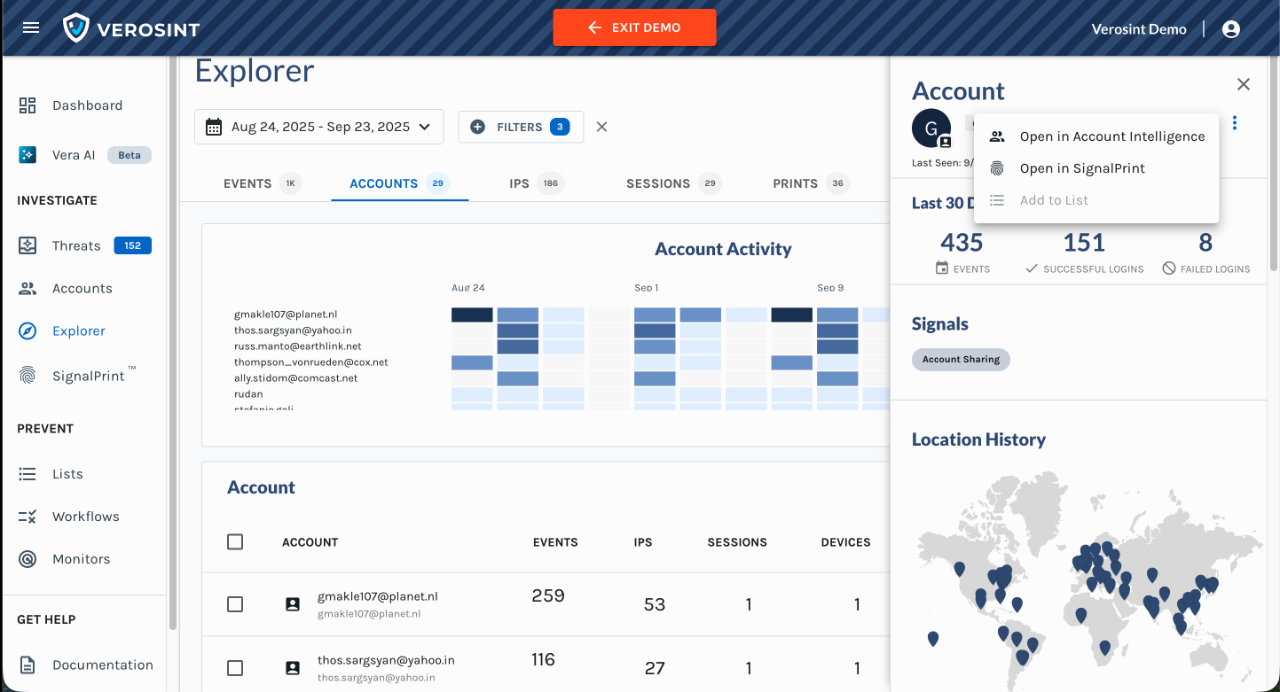 - Start investigating in Event Explorer, then continue seamlessly to Account Intelligence, SignalPrint, or Lists.