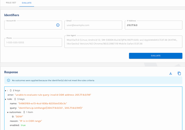 identifiers.ip.isInRangeidentifier and enter the values that should be restricted. Enter a Reason for the Action if the conditions of the rule are met. -