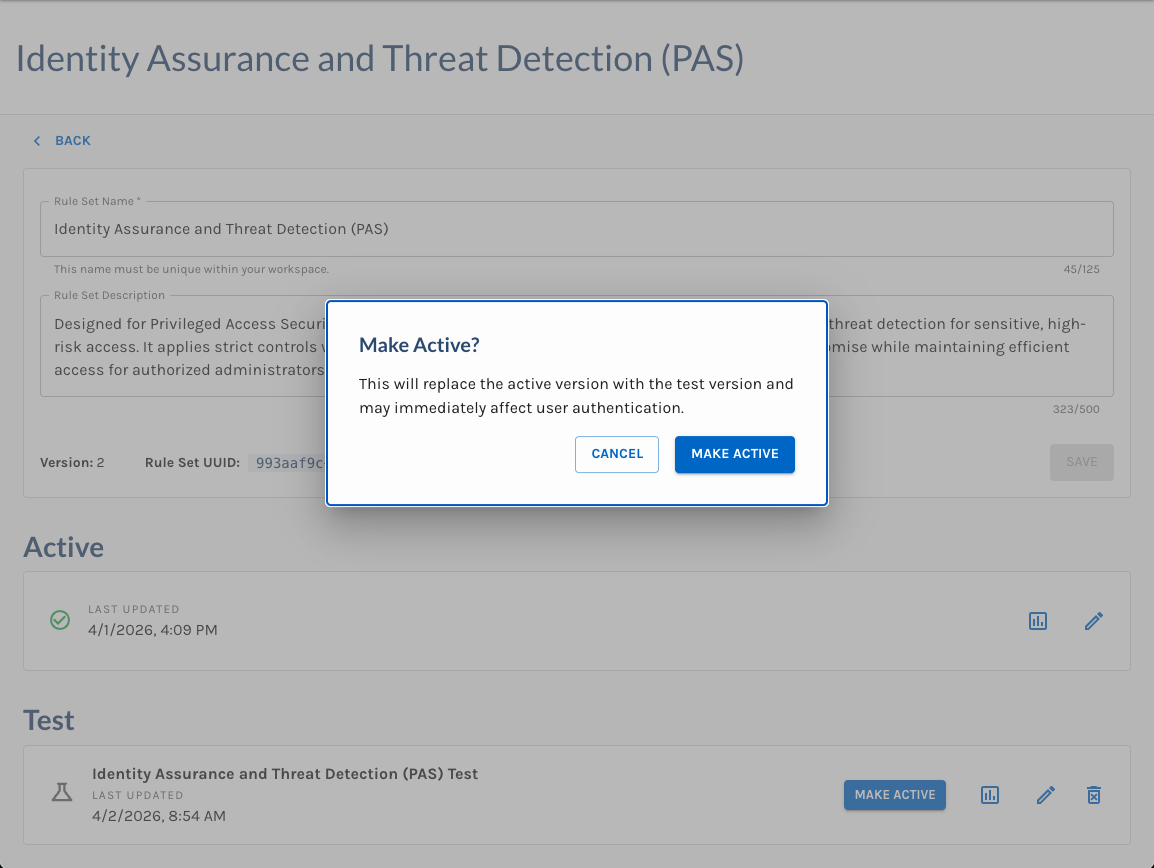 After promotion, the test configuration becomes the new active version of the rule set and may immediately affect user authentication.