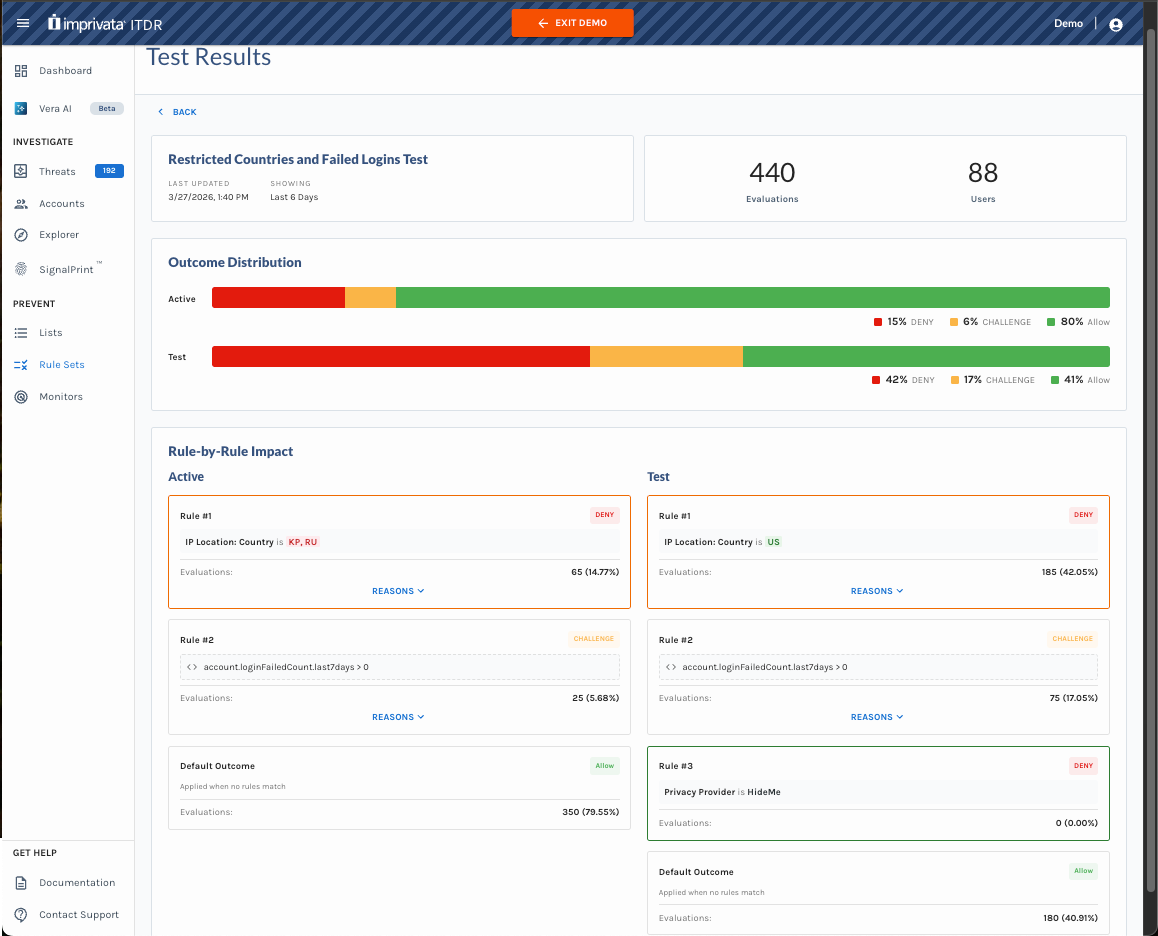 - Test results show how the rule set would behave if the test version was active. It does not impact end users.