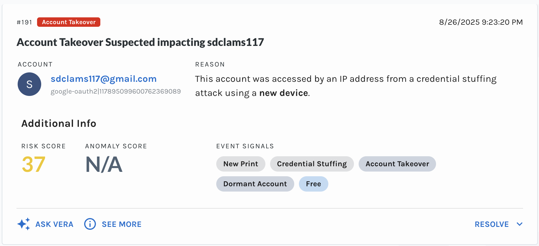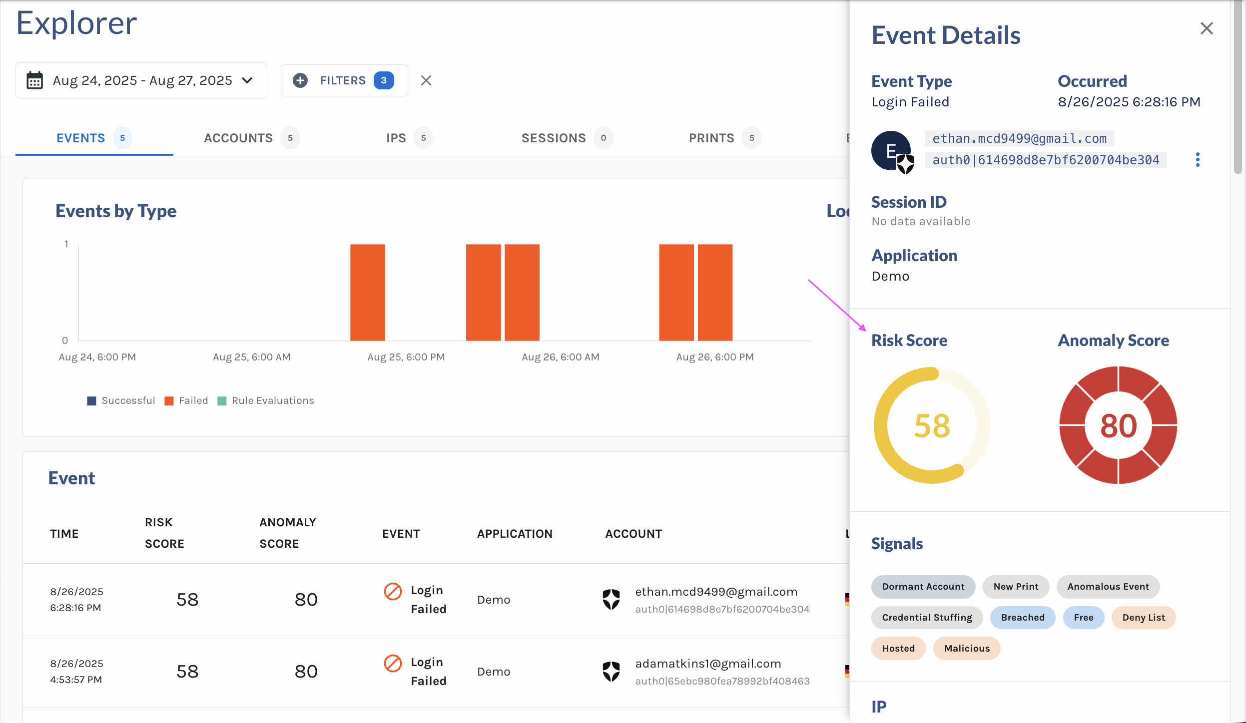 Quickly detecting credential stuffing is critical for reducing the number of account takeovers, in which third-party actors can use an account for malicious purposes. You can find events that indicate credential stuffing in the Event Explorer using the event.risks