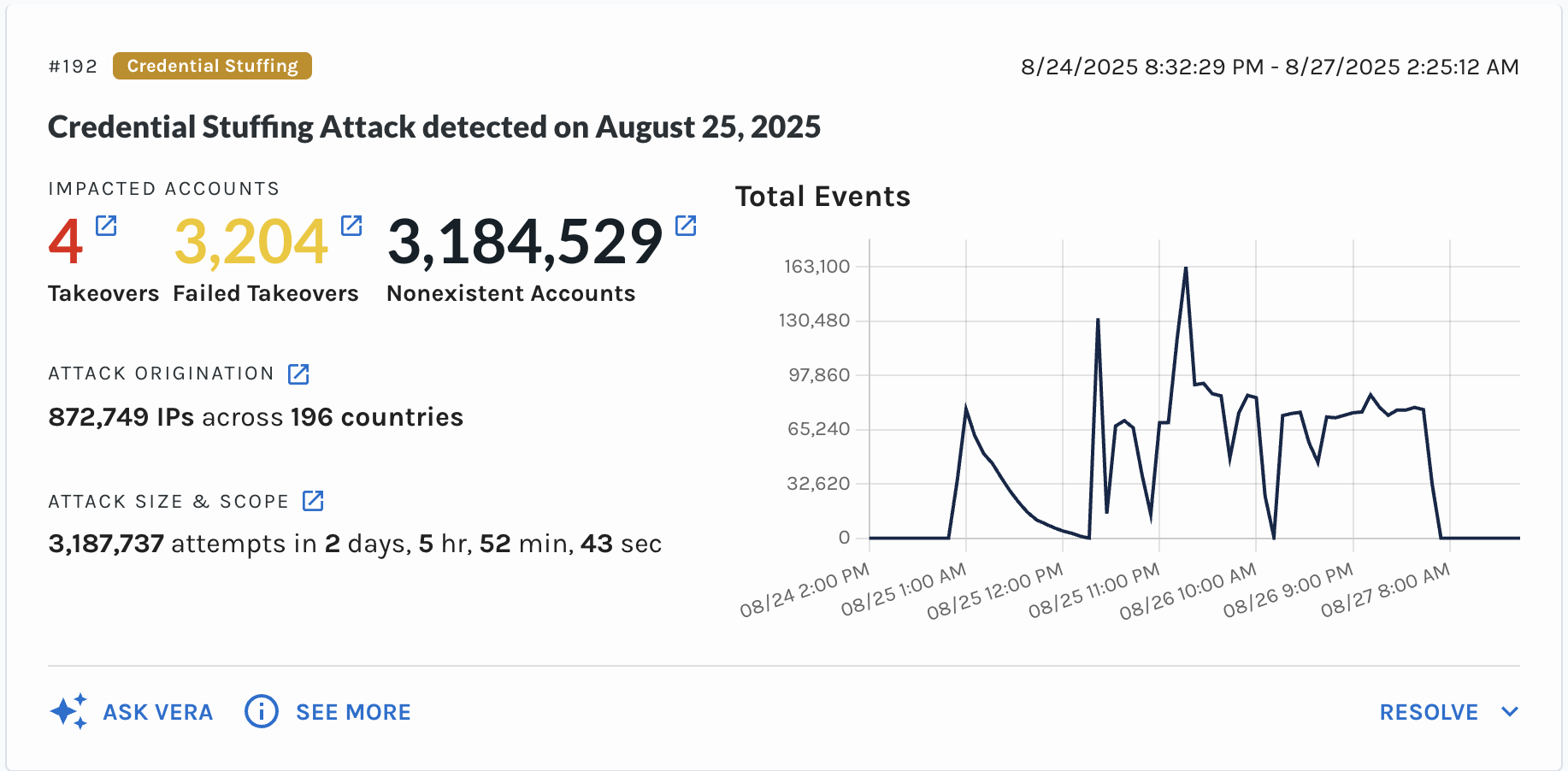 Credential stuffing uses automated tools to try several username and password combinations obtained from data breaches. Attackers try to access user accounts by exploiting the fact that many people reuse the same credentials across multiple online platforms. Verosint determines a Credential Stuffing attack based on many login event failures over a short period of time, followed by a success. The IP address and ASN will generally be the same.